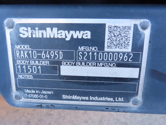 | 備考 | ワイド システムフロア 後輪エアサス ハイルーフ バックカメラ 格納P/G(新明和) XL42LOC-U 設定-30℃ -22℃/3h(庫内17℃) ETC2.0 アルミホイール 中型免許対応 Mキー1 Sキー3 |
