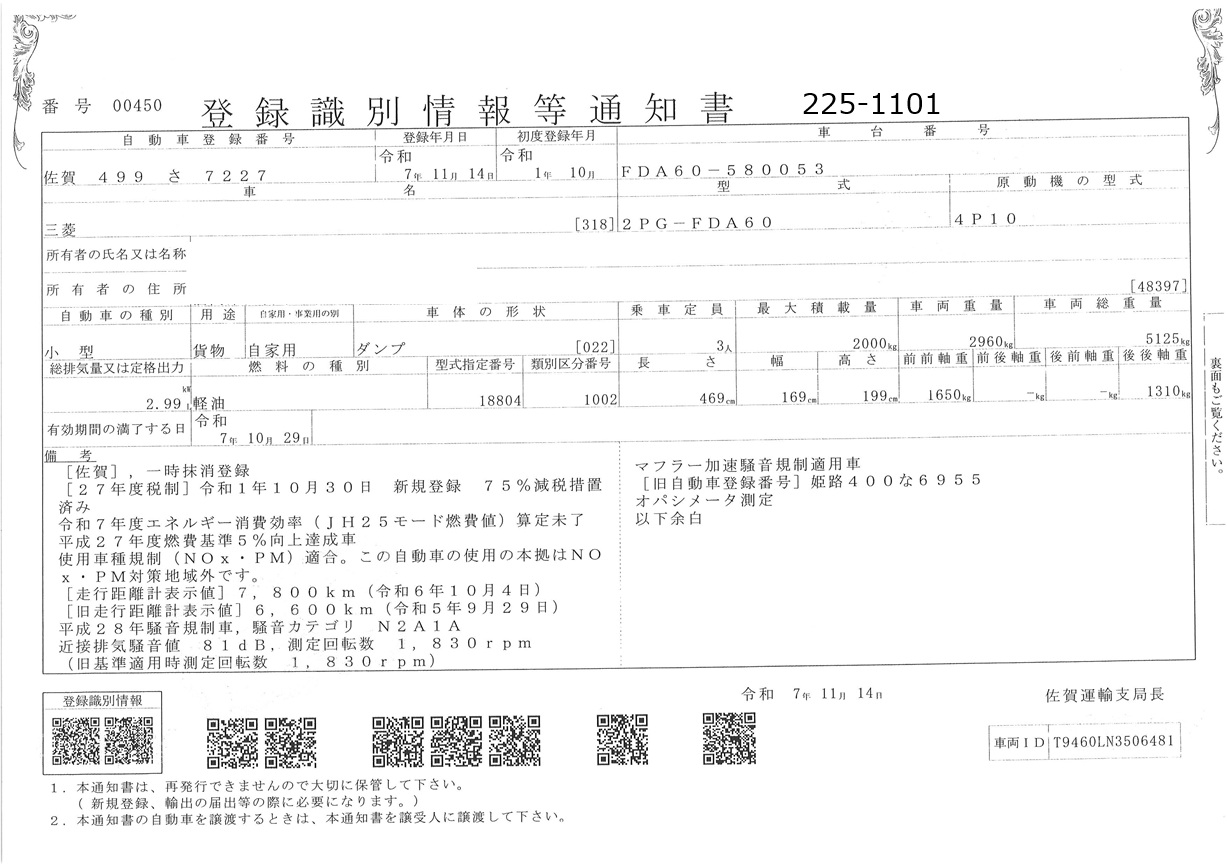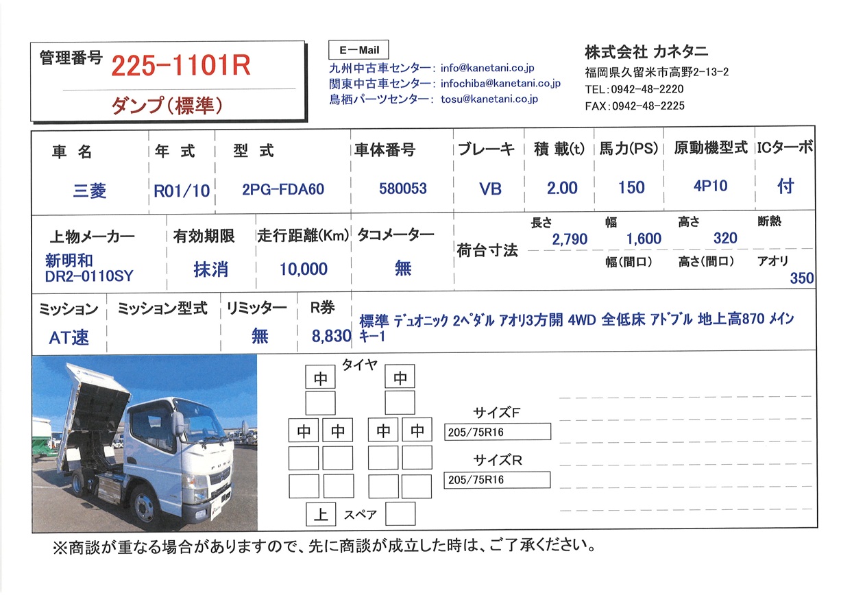 | 備考 | 4WD 標準 デュオニック 2ペダル アオリ3方開 全低床 アドブル 地上高870 メインキー1 記録簿R3-6 |