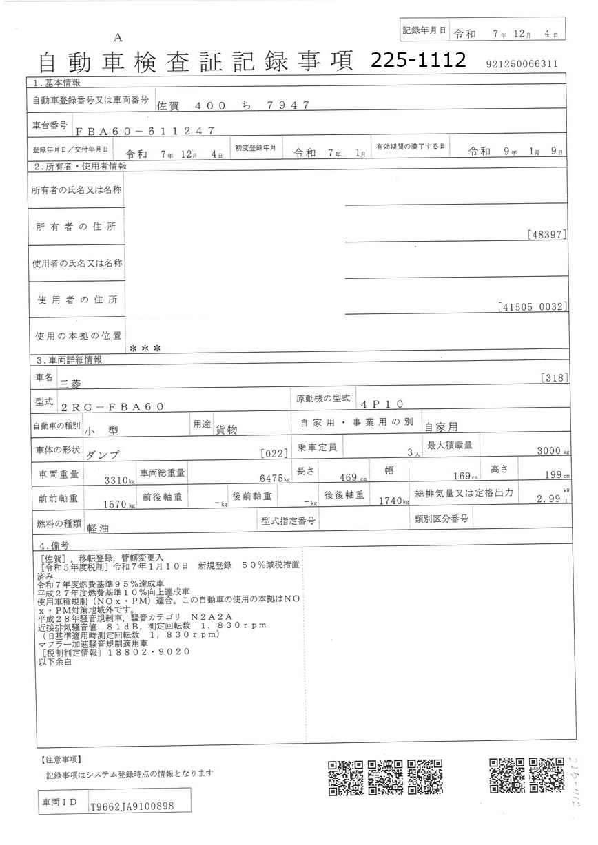 お問い合わせ番号:225-1112R| クラス(車両) | 小型 | メーカー | 三菱 |
