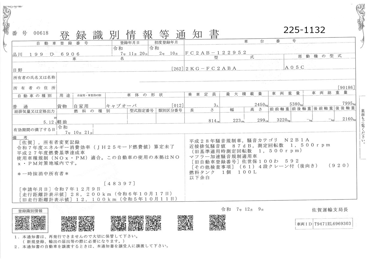 | 備考 | 4段ラジコンフックイン 標準 ベッドレス 木床 差違い アオリ3方開 ETC2.0 地上高1050 アドブル無 メインキー2 スペアキー2 |