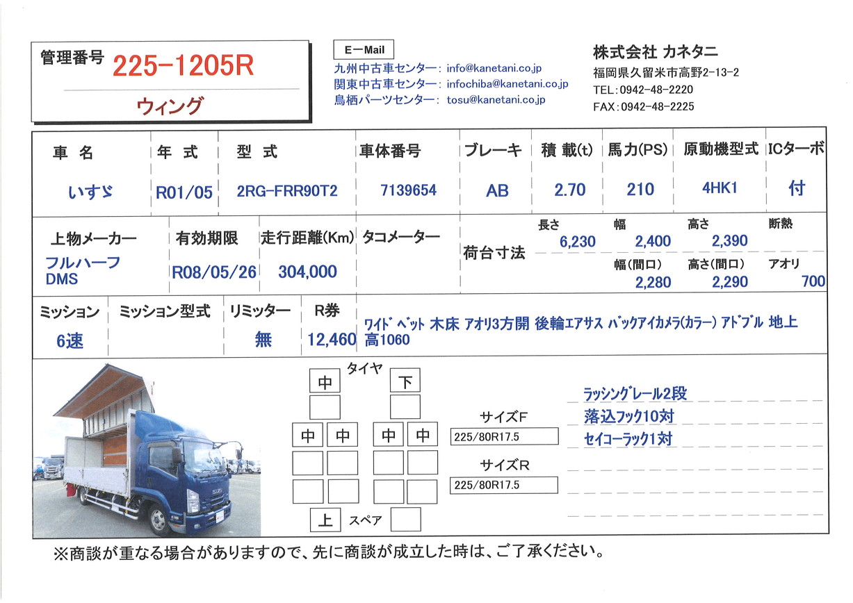 | 備考 | ワイド ベッド 木床 アオリ3方開 後輪エアサス バックアイカメラ(カラー) アドブル 地上高1060 |