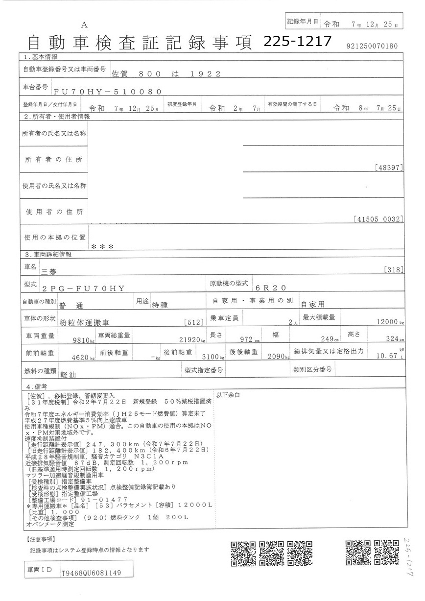 | 車検期限 | R08/07/25 | 走行距離 | 268,500Km |