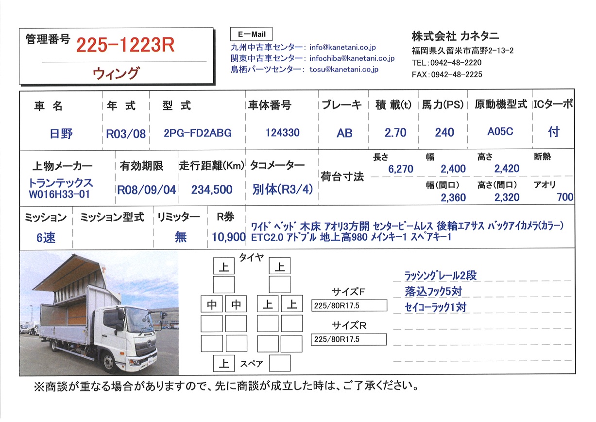 | 備考 | ワイド ベッド 木床 アオリ3方開 センタービームレス 後輪エアサス バックアイカメラ(カラー) ETC2.0 アドブル 地上高980 メインキー1 スペアキー1 |