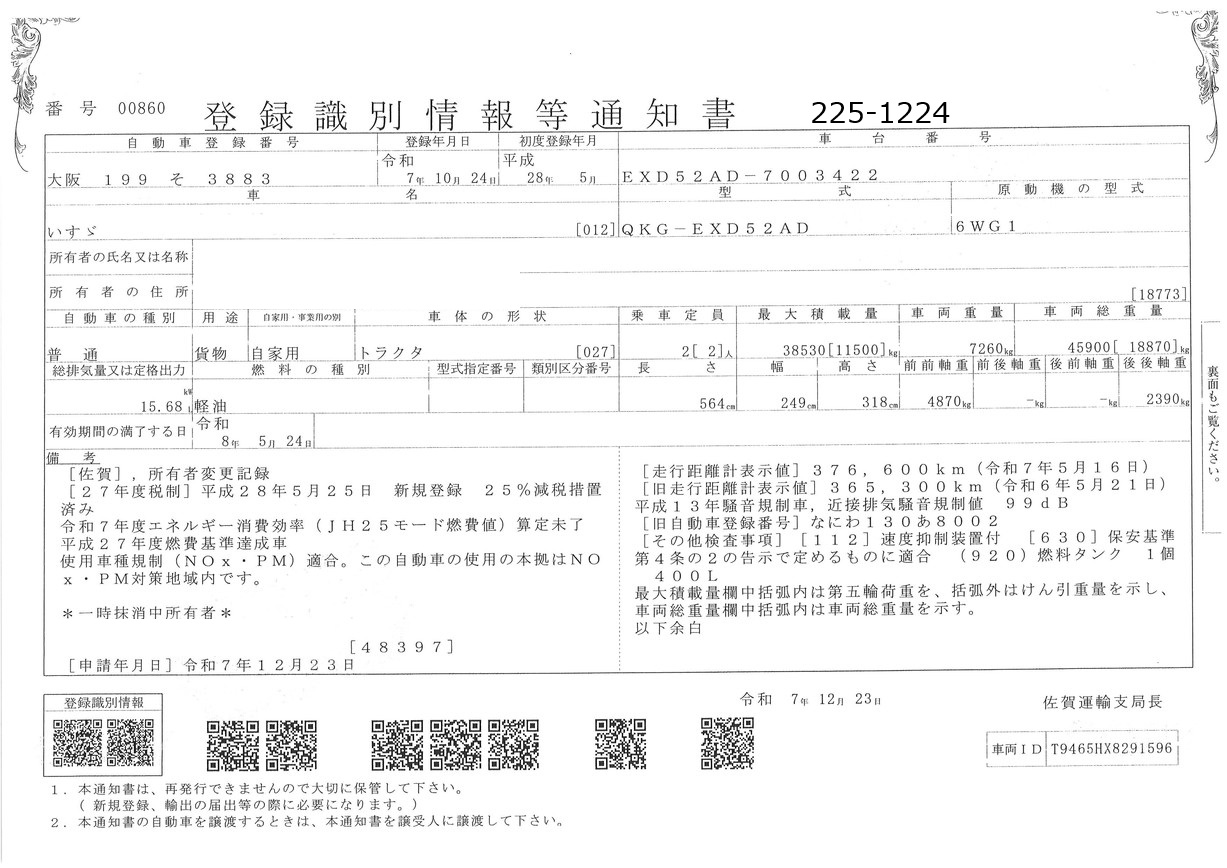 | 車検期限 | 抹消 | 走行距離 | 380,000Km |