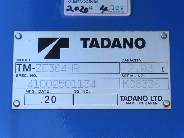 | 備考 | 標準 ベッド 鉄床 アルミB アオリ3方開 タダノ 4段ラジコンフックイン TM-ZE364HR 差違 アルミホイール ETC 地上高1070 アドブル Mキー1 Sキー2 |