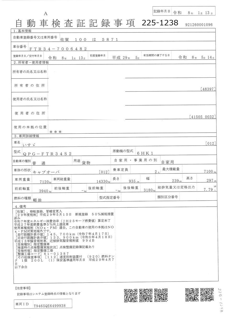 お問い合わせ番号:225-1238R| クラス(車両) | 大型 | メーカー | いすゞ |