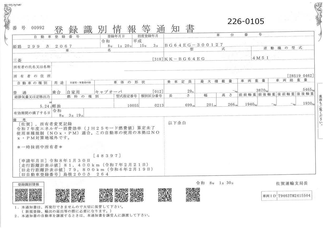 | 備考 | 4WD 29人乗り オートスイングドア モケットシート リクライニング Rヒーター付 アドブル無 メインキー3本 |