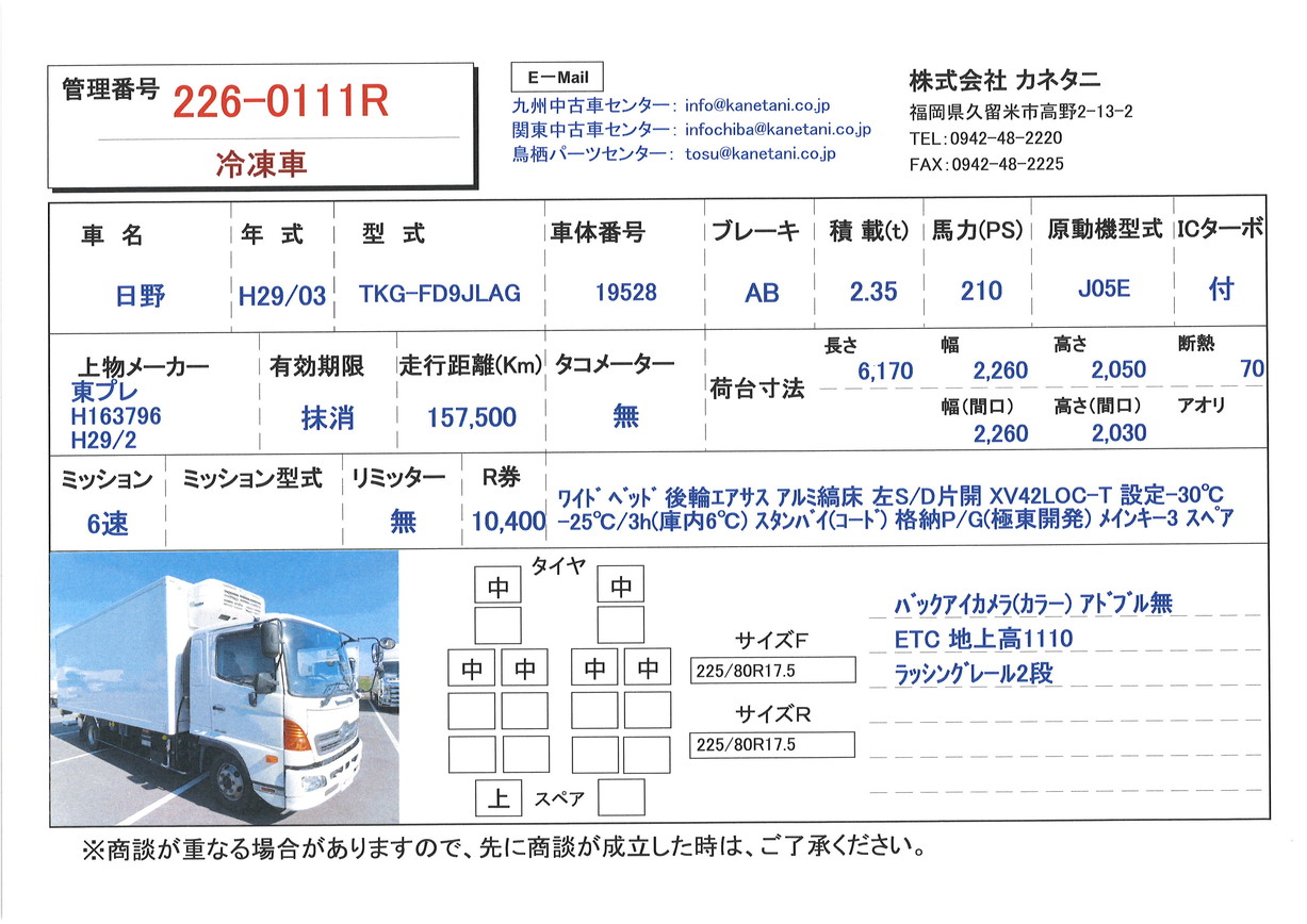| 備考 | ワイド ベッド 後輪エアサス アルミ縞床 左S/D片開 XV42LOC-T 設定-30℃ -25℃/3h(庫内6℃) スタンバイ(コード) 格納P/G(極東開発) メインキー3 スペアキー1 |