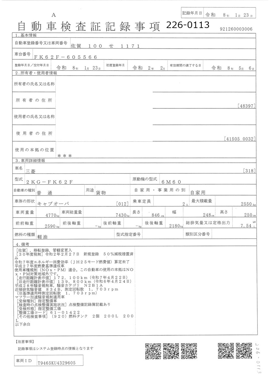 お問い合わせ番号:226-0113R| クラス(車両) | 中型 | メーカー | 三菱 |
