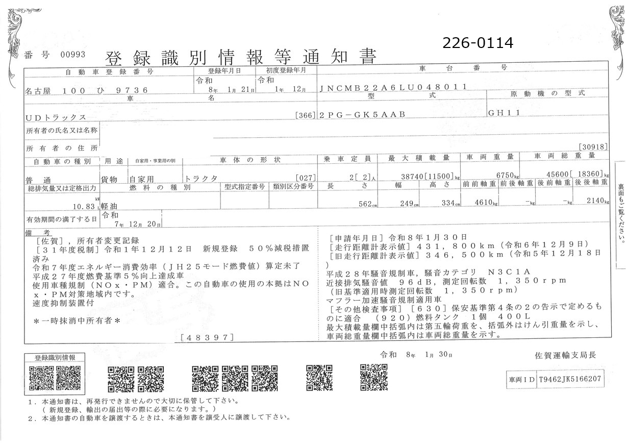 | 形状 | トラクター | 年式 | R01/12 |
