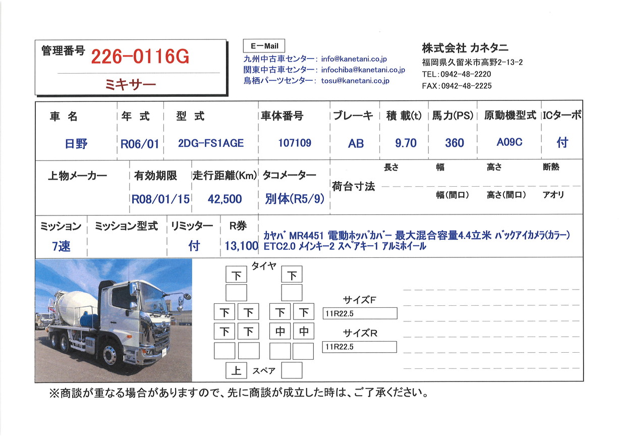 | 備考 | カヤバ MR4451 電動ホッパカバー 最大混合容量4.4立米 バックアイカメラ(カラー) ETC2.0 メインキー2 スペアキー1 アルミホイール |