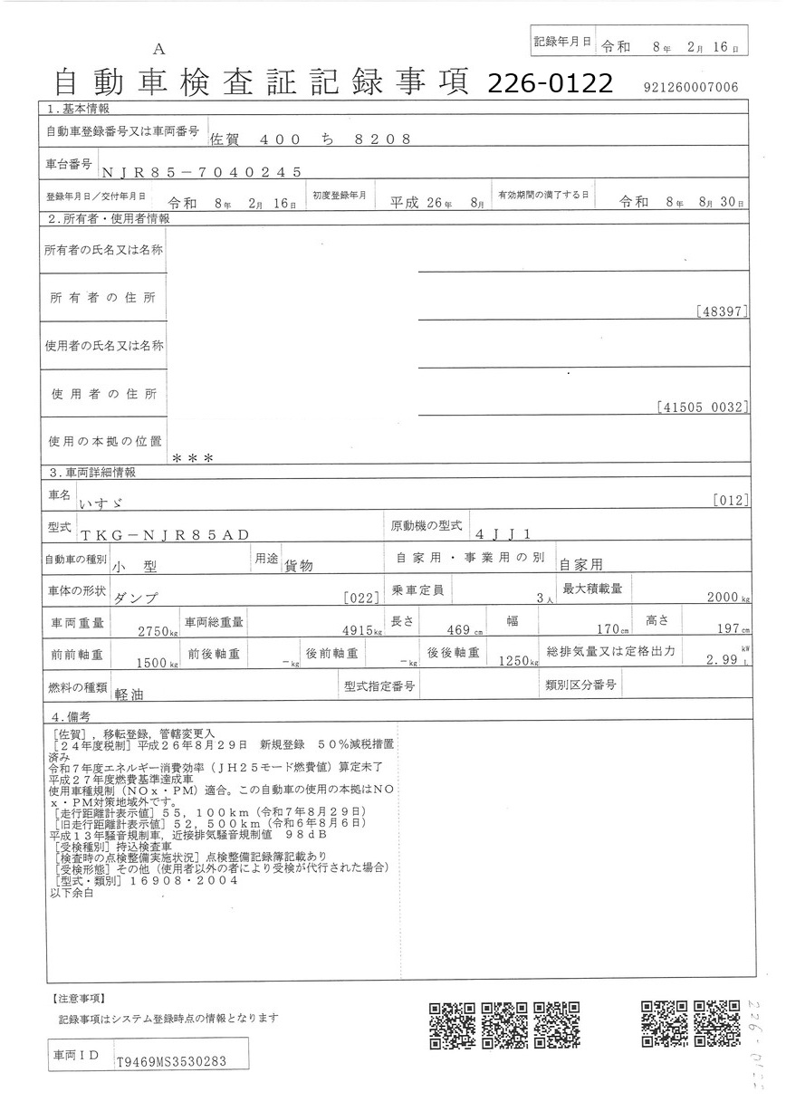 | 備考 | 標準 アオリ3方開 アドブル無 手動コボレーン ETC 地上高850 メインキー1 スペアキー2 |