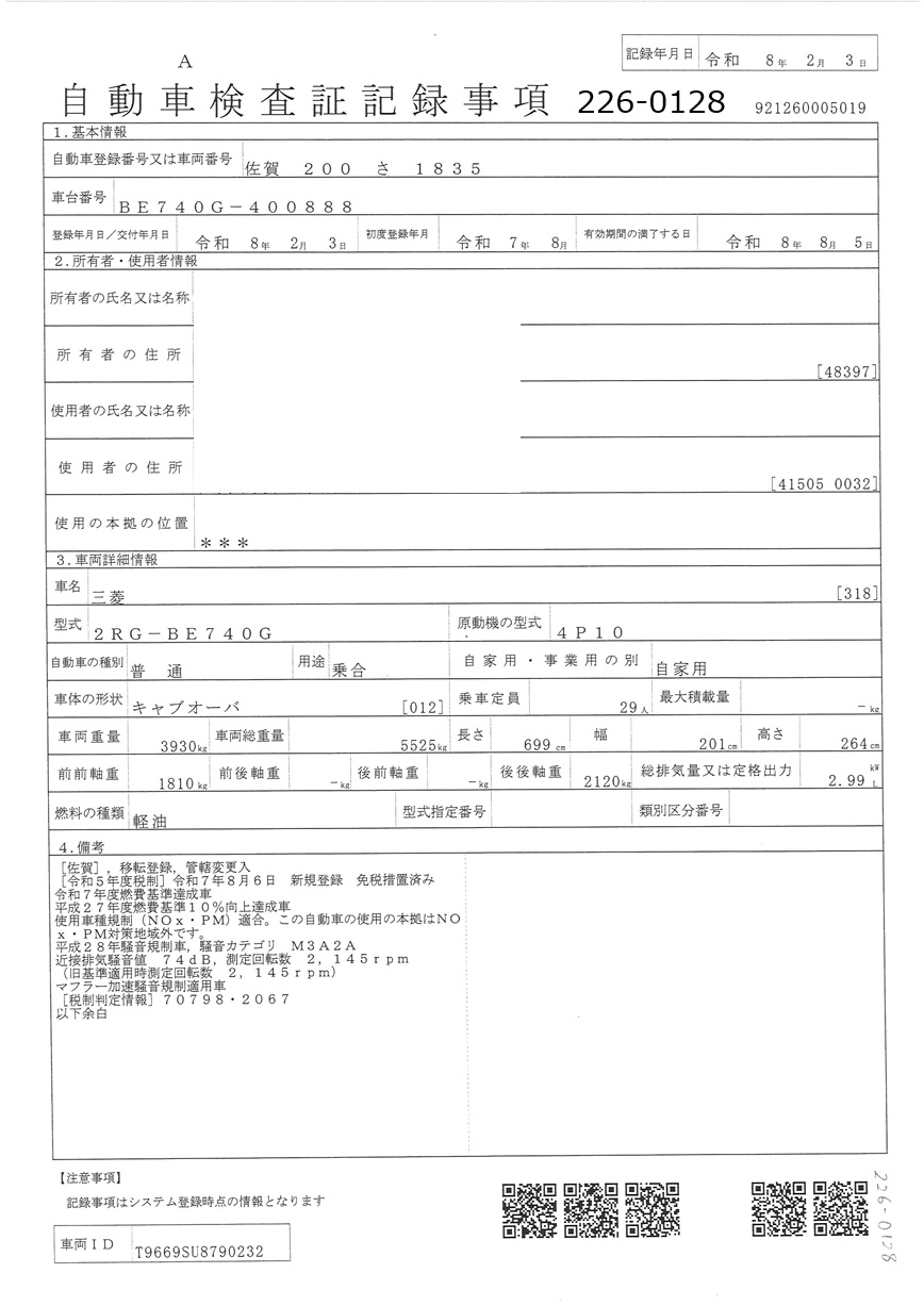 | 車両形式 | 2RG-BE740G | エンジン馬力 | 175PS |