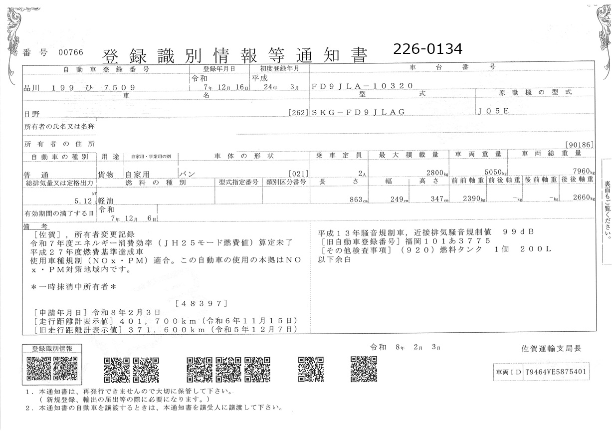 | 車検期限 | 抹消 | 走行距離 | 455,000Km |