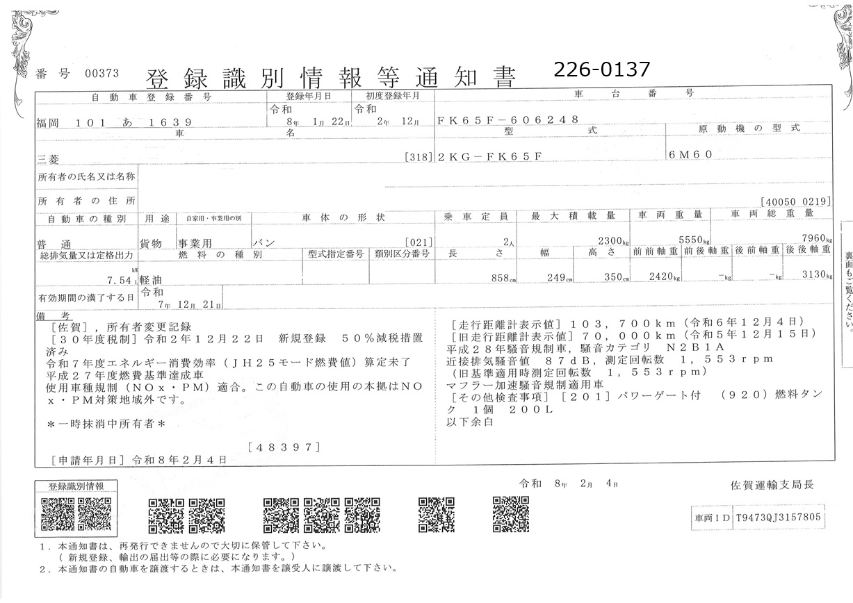 | 車検期限 | 抹消 | 走行距離 | 153,000Km |