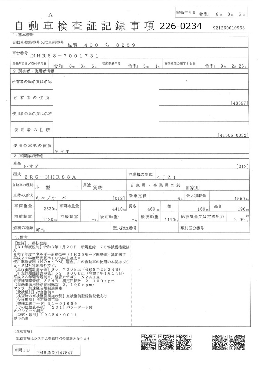 | 車両形式 | 2RG-NHR88A | エンジン馬力 | 0PS |