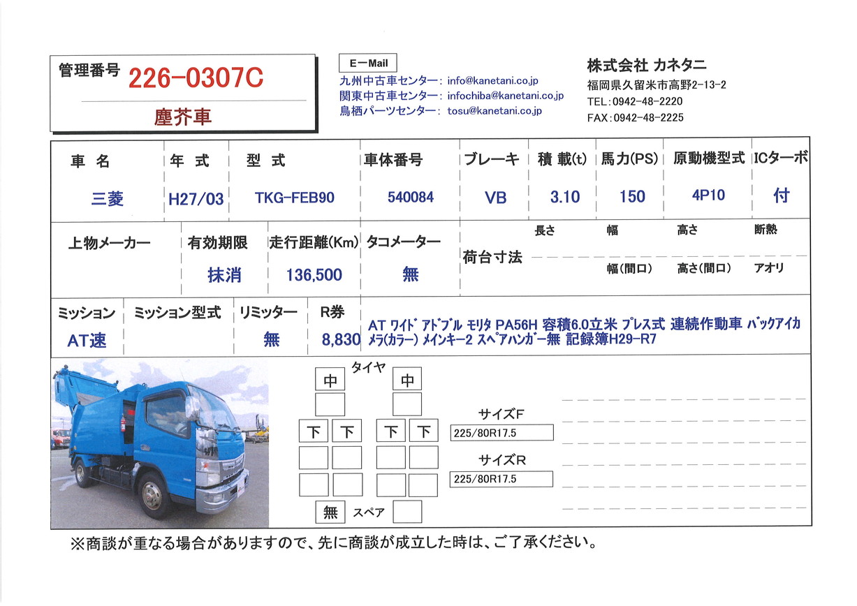 | 形状 | 塵芥車 | 年式 | H27/03 |
