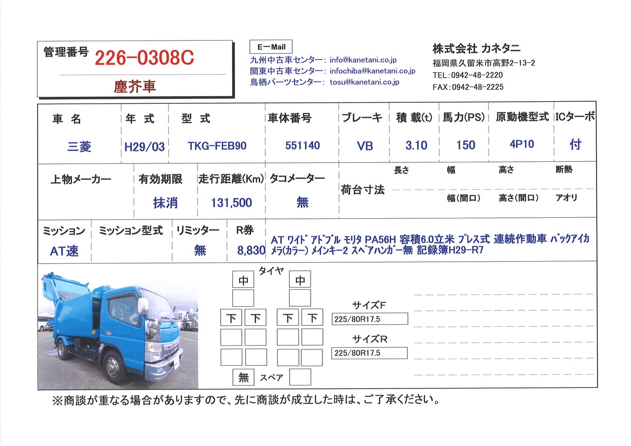 | 形状 | 塵芥車 | 年式 | H29/03 |
