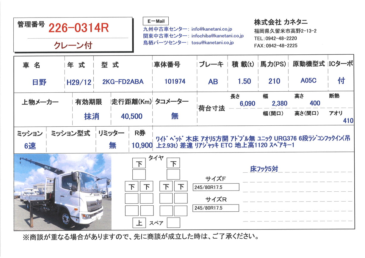 | 備考 | ワイド ベッド 木床 アオリ5方開 アドブル無 ユニック URG376 6段ラジコンフックイン(吊上2.93t) 差違 リアジャッキ ETC 地上高1120 スペアキー1 |