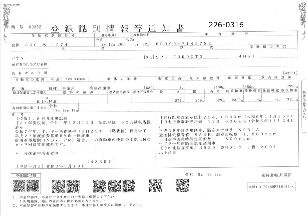 | 形状 | 冷凍車 | 年式 | R01/12 |