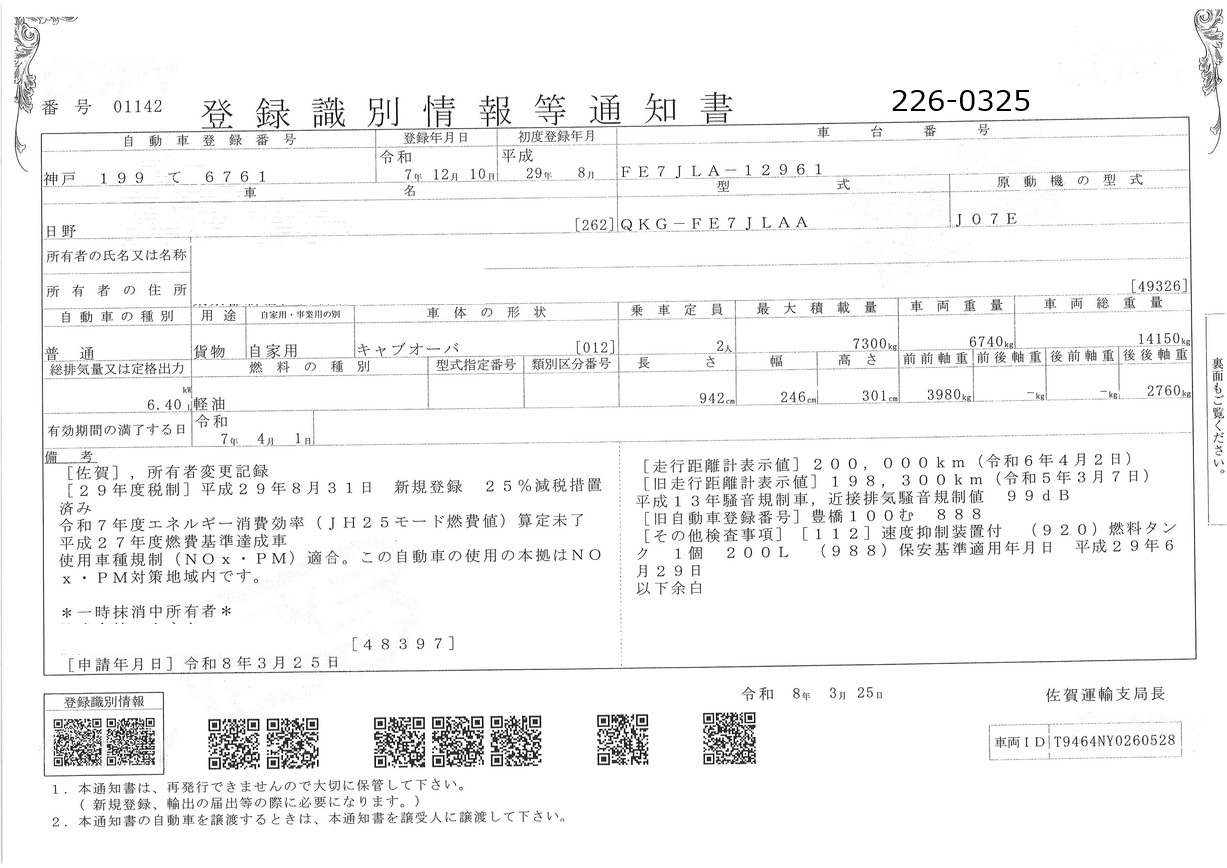 お問い合わせ番号:226-0325R| クラス(車両) | 大型 | メーカー | 日野 |