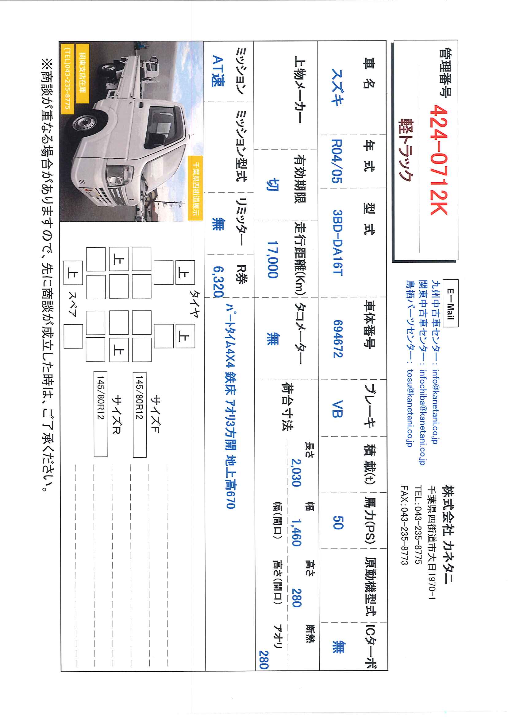 お問い合わせ番号:424-0712K| クラス(車両) | 小型 | メーカー | スズキ |