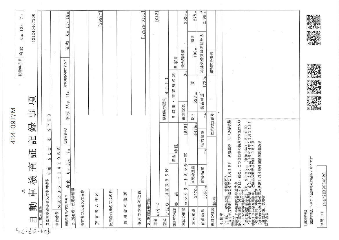 | 車両形式 | TKG-NKR85N | エンジン馬力 | 150PS |
