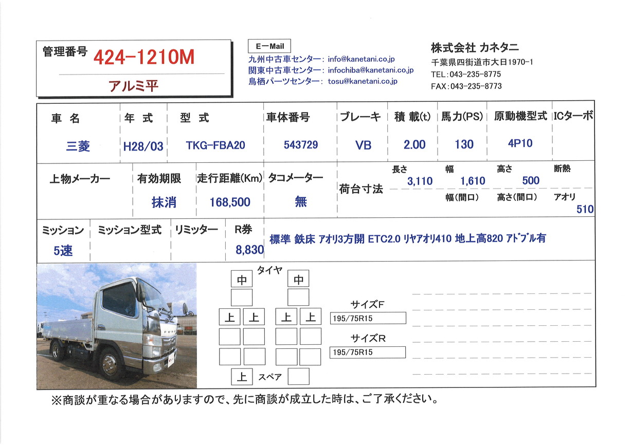 | 備考 | 標準 鉄床 アオリ3方開 ETC2.0 リヤアオリ410 地上高820 アドブル有 アルミブロック |