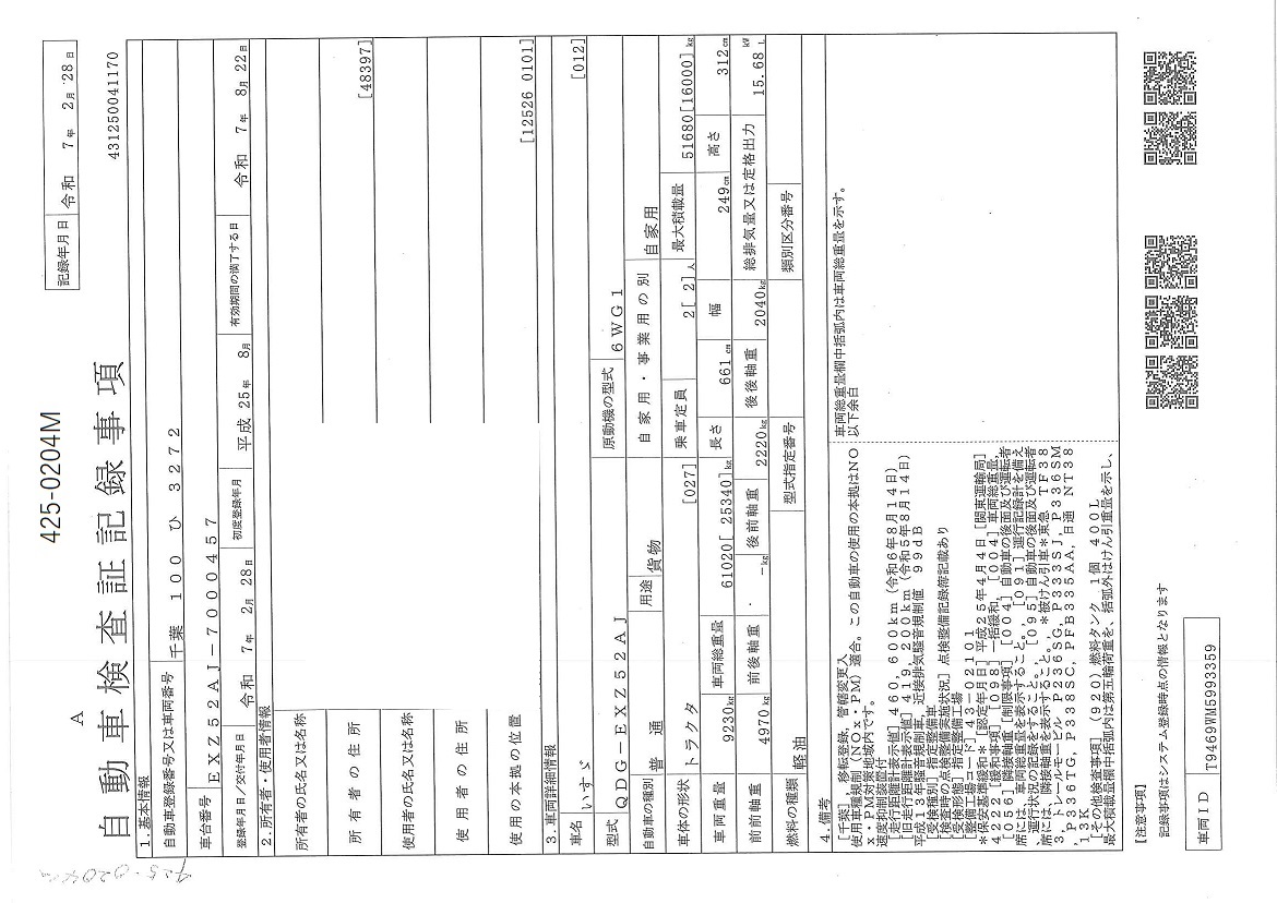 お問い合わせ番号:425-0204M| クラス(車両) | 大型 | メーカー | いすゞ |
