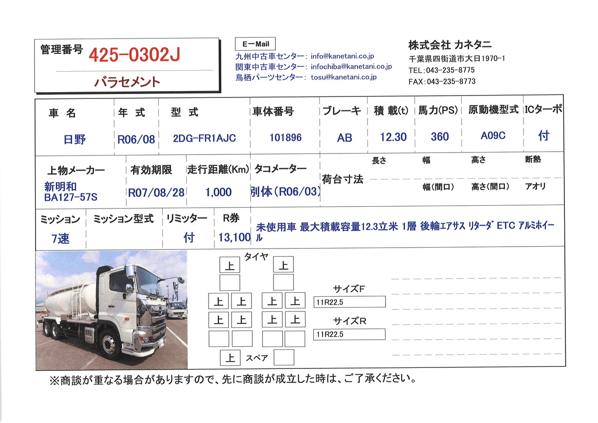 | 備考 | 未使用車 最大積載容量12.3立米 1層 後輪エアサス リターダ ETC アルミホイール |