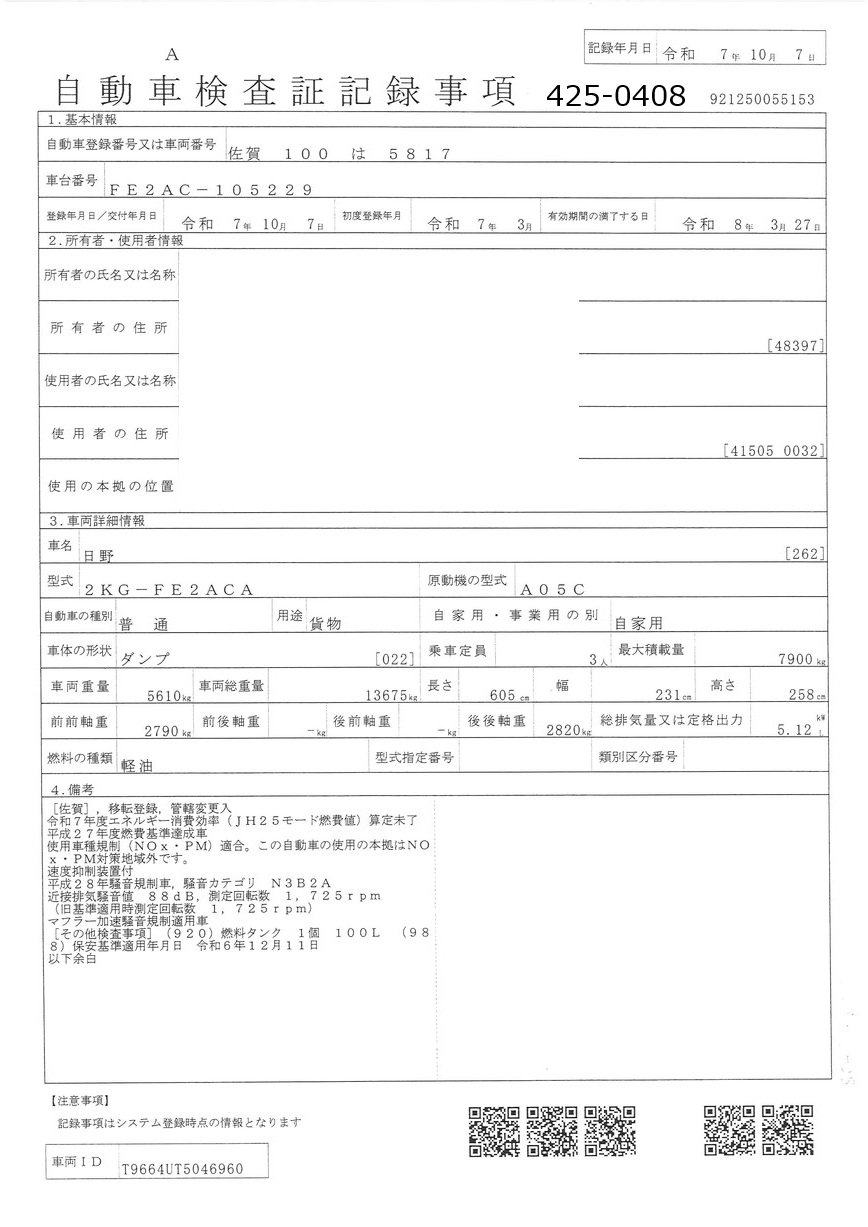 車両形式 | 2KG-FE2ACA | エンジン馬力 | 240PS |