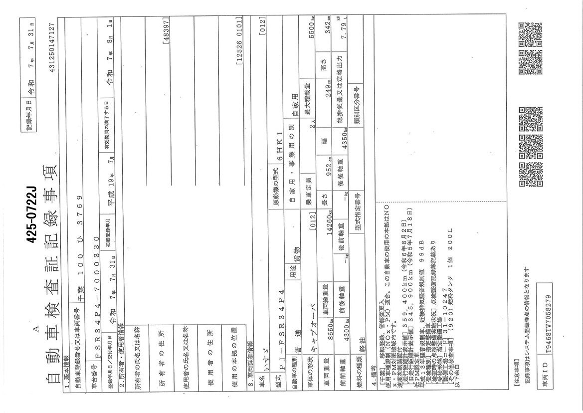 お問い合わせ番号:425-0722J| クラス(車両) | 大型 | メーカー | いすゞ |