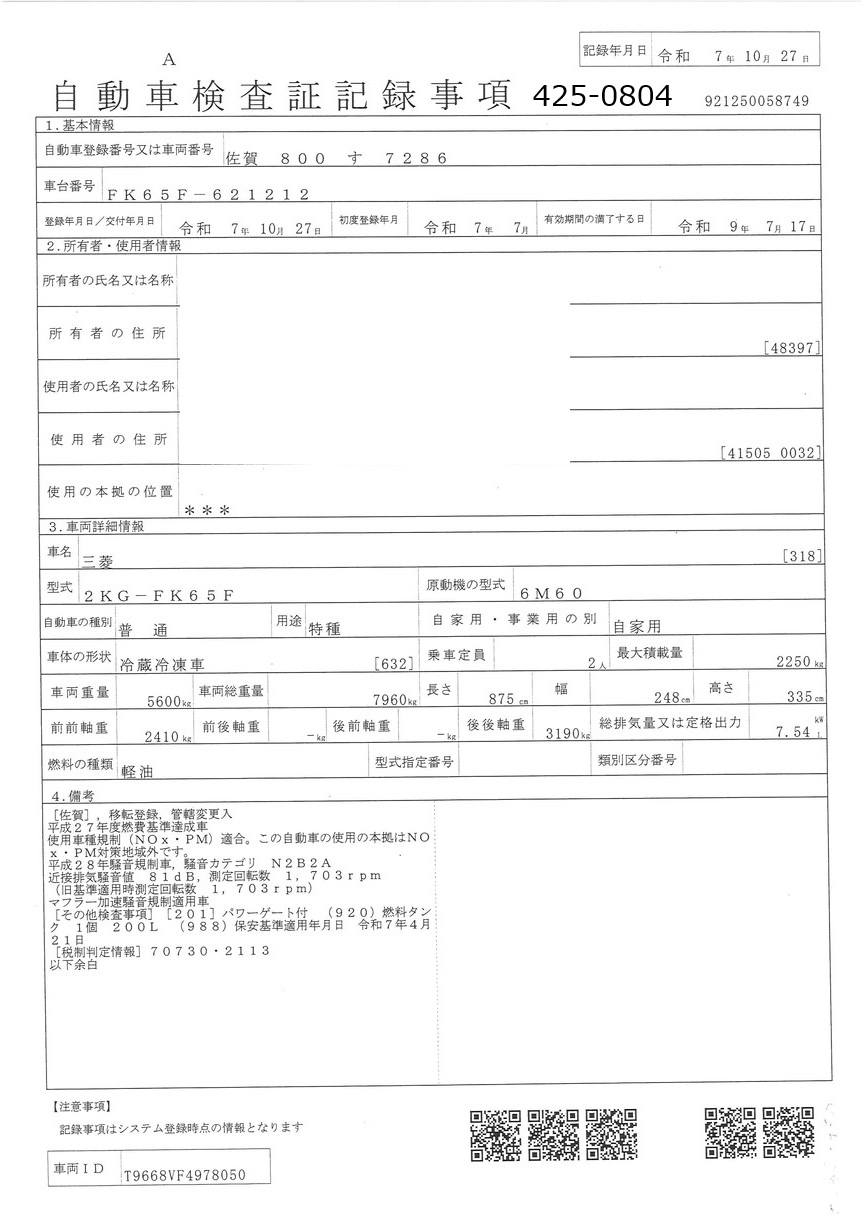 | 形状 | 冷凍車 | 年式 | R07/07 |