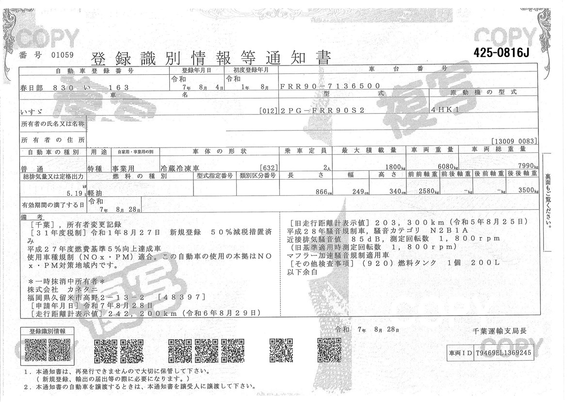 | 車両形式 | 2PG-FRR90S2 | エンジン馬力 | 240PS |
