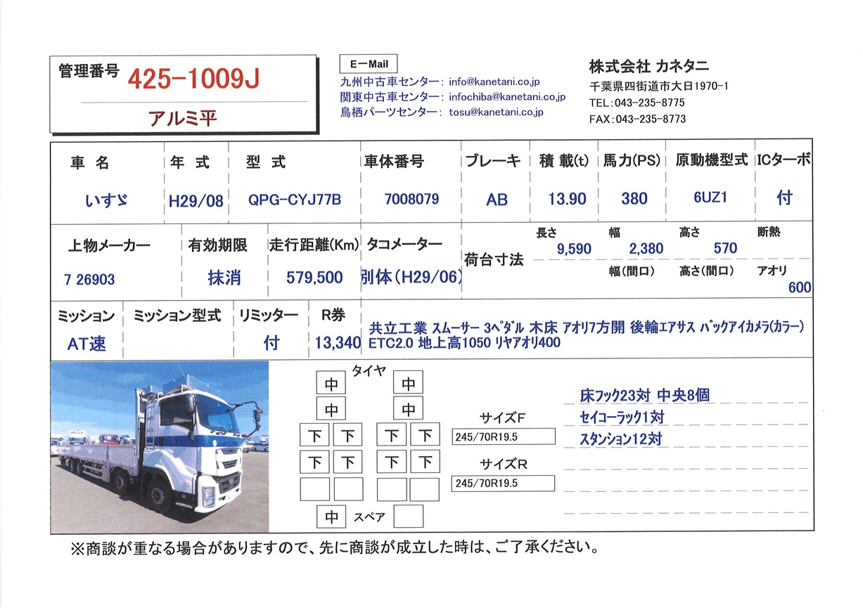 | 備考 | 共立工業 スムーサー 3ペダル 木床 アオリ7方開 後輪エアサス バックアイカメラ(カラー) ETC2.0 地上高1050 リヤアオリ400 |