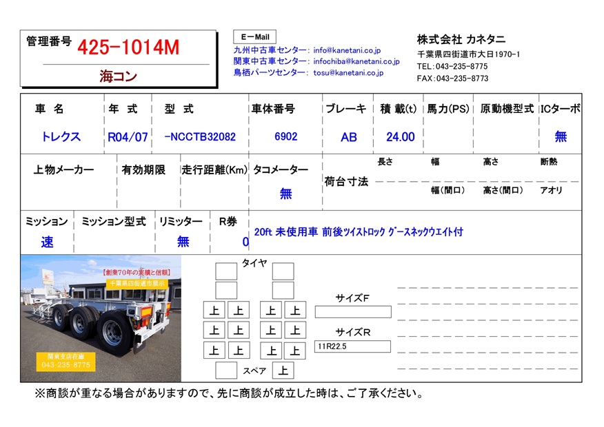 | 備考 | 20ft 未使用車 前後ツイストロック グースネックウエイト付 |