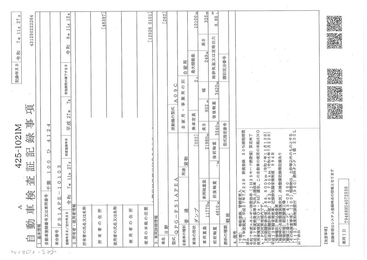 | 備考 | オールステン(リブ+根太鉄) 床5㎜ F,R左右4㎜ 水密 ETC 2デフ 電動コボレーン アルミホイール スペアキー3本 記録簿28-R7 |