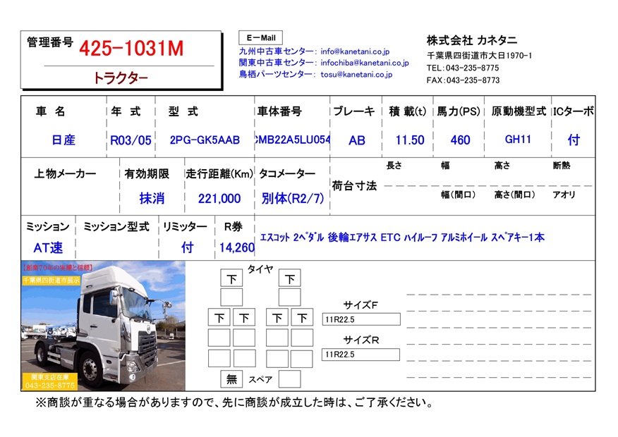 お問い合わせ番号:425-1031M| クラス(車両) | 大型 | メーカー | 日産 |