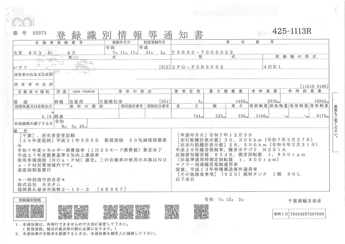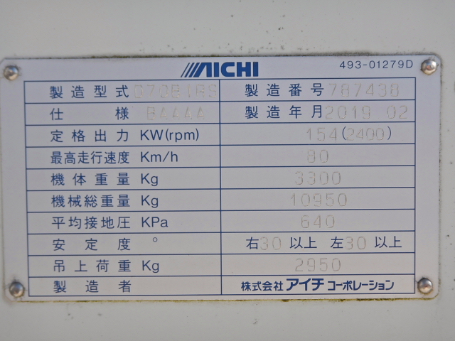 | 備考 | バックアイカメラ(カラー) 記録簿R2-R7 ETC 3段フックイン(吊上2.95t) リアジャッキ アウトリガー4方張出 CHKリール有 抜柱機有 450㎜オーガ スペアキー無 |