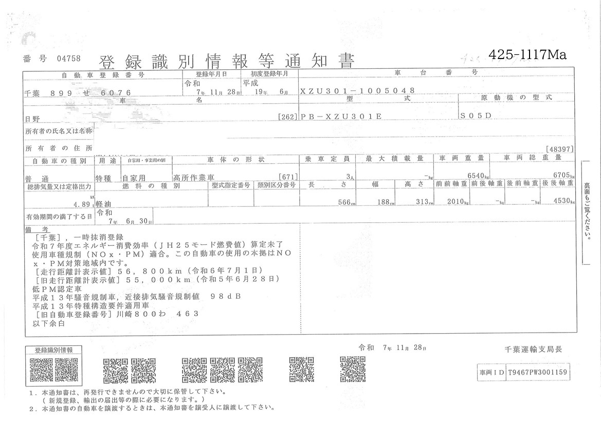 | 車両形式 | PB-XZU301E | エンジン馬力 | 0PS |