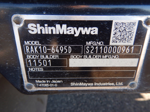 | 備考 | 融雪仕様 ワイド システムフロア 後輪エアサス バックアイカメラ(カラー) 格納P/G(新明和)ラジコン 冷凍機XL42LOC-U -25℃/3h ETC ハイルーフ アルミホイール 記録簿R5-R7 |