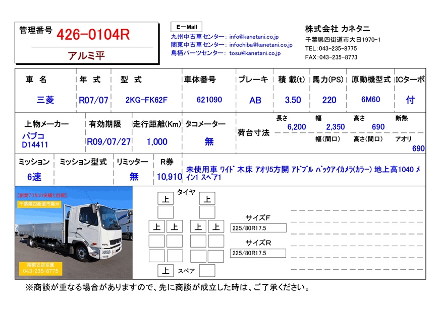 | 備考 | 未使用車 ワイド 木床 アオリ5方開 アドブル バックアイカメラ(カラー) 地上高1040 メイン1 スペア1 |