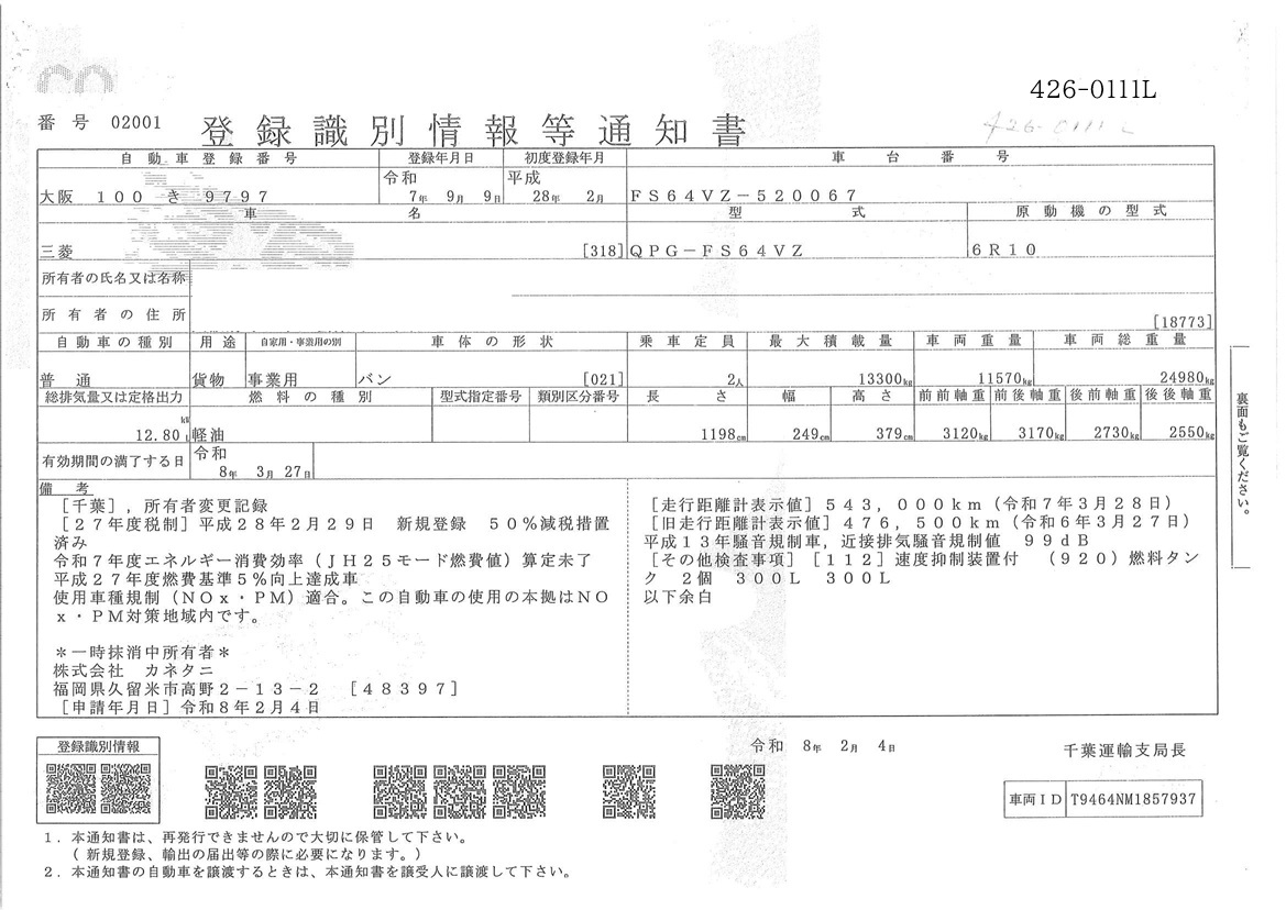 お問い合わせ番号:426-0111L| クラス(車両) | 大型 | メーカー | 三菱 |