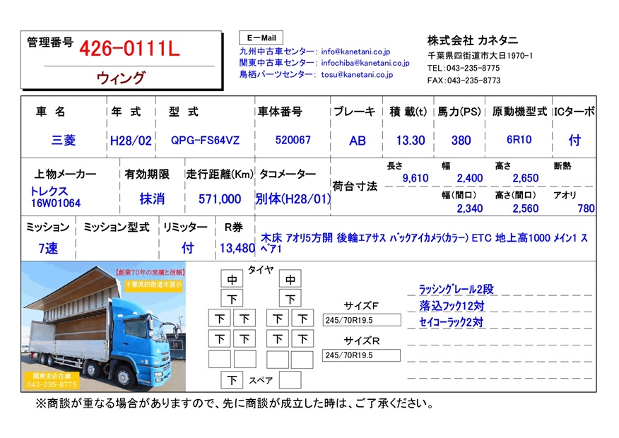 | 備考 | 木床 アオリ5方開 後輪エアサス バックアイカメラ(カラー) ETC 地上高1000 メイン1 スペア1 |
