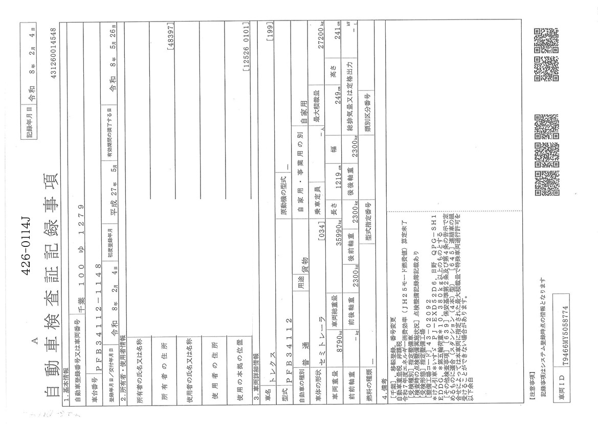 | 車検期限 | R08/05/26 | 走行距離 | Km |
