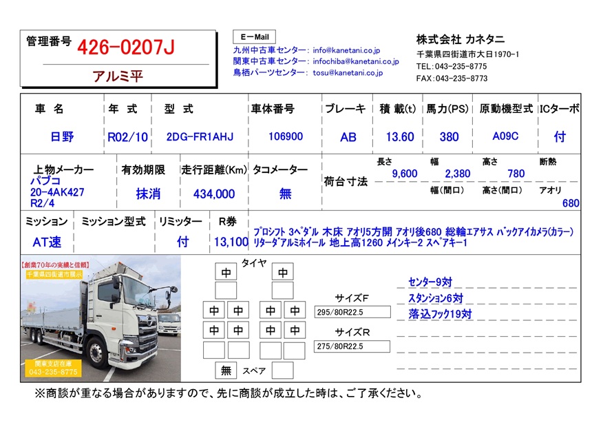 | 備考 | プロシフト 3ペダル 木床 アオリ5方開 Rアオリ680 総輪エアサス バックアイカメラ(カラー) リターダアルミホイール 地上高1260 メインキー2 スペアキー1 |