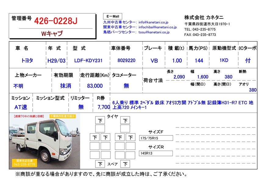 | 備考 | 6人乗り 標準 2ペダル 鉄床 アオリ3方開 アドブル無 記録簿H31-R7 ETC 地上高720 メインキー1 |