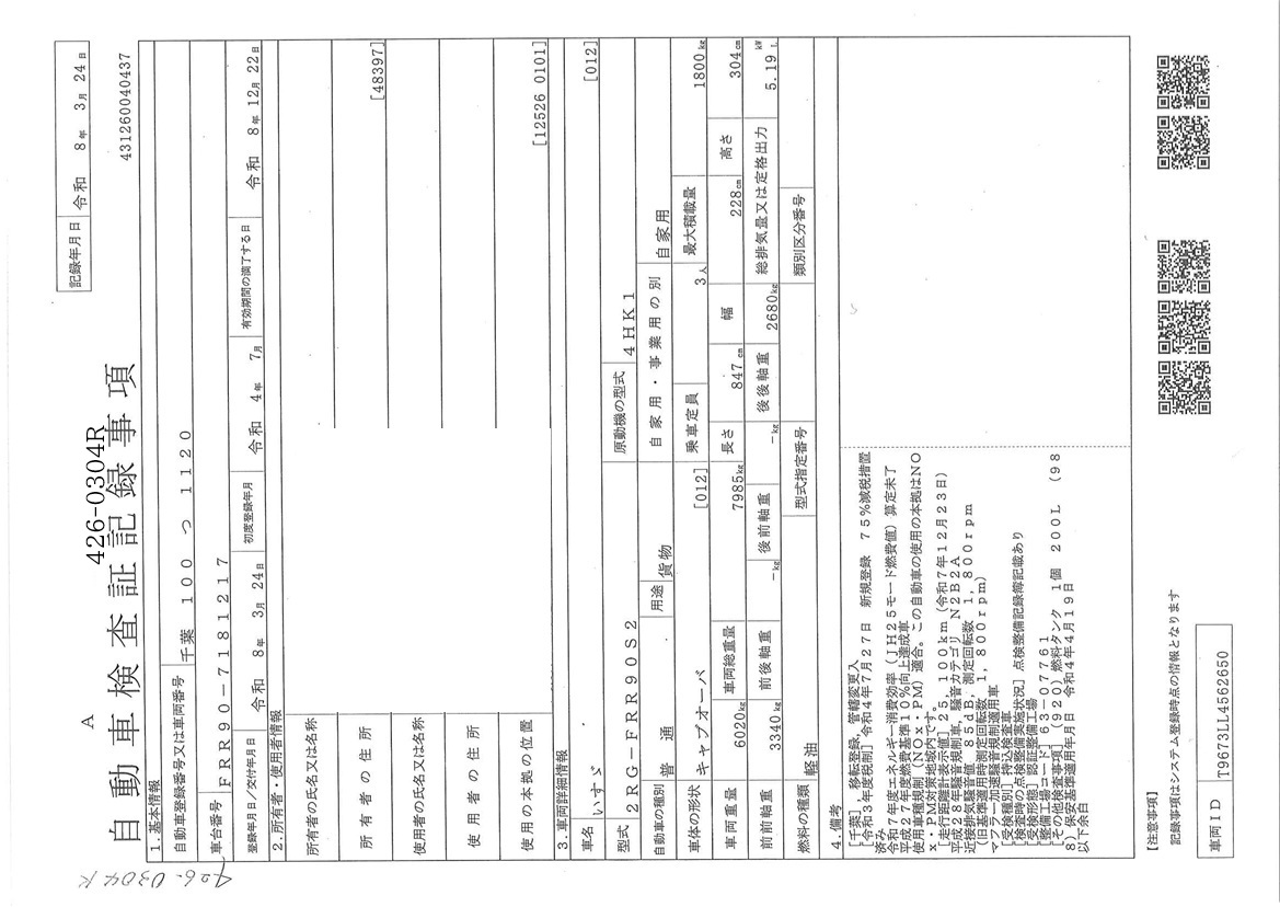 | 車両形式 | 2RG-FRR90S2 | エンジン馬力 | 210PS |