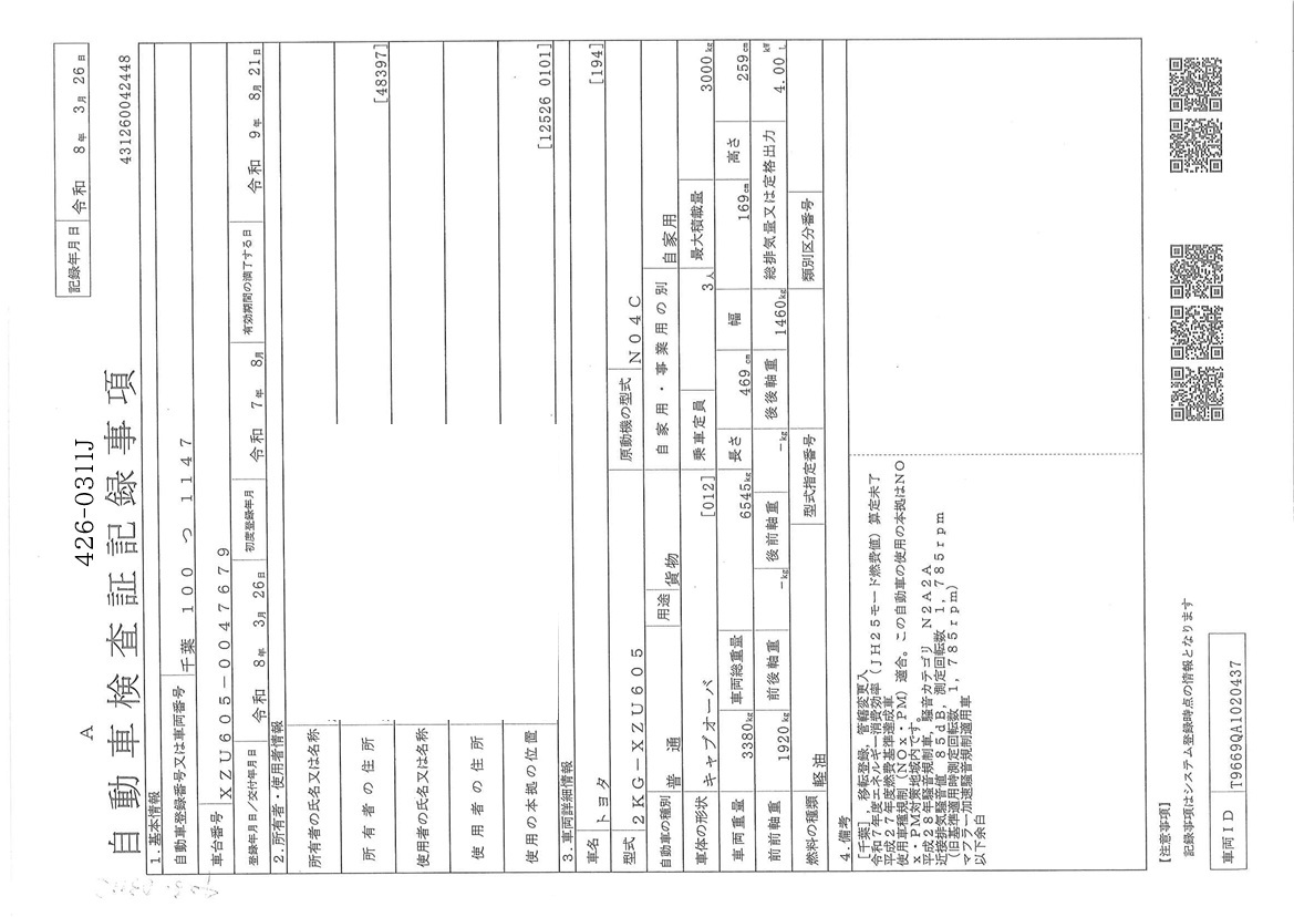 お問い合わせ番号:426-0311J| クラス(車両) | 小型 | メーカー | トヨタ |