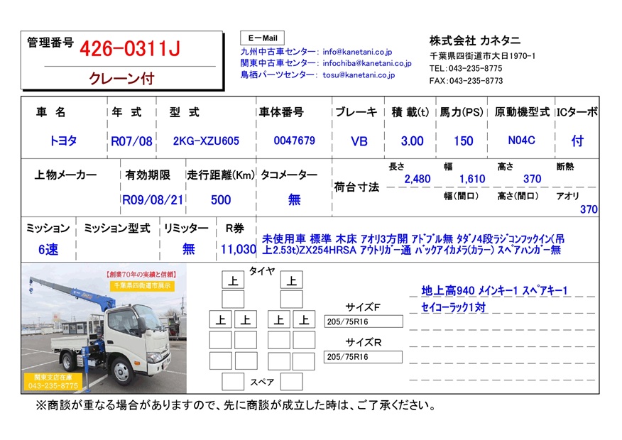 | 備考 | 未使用車 標準 木床 アオリ3方開 アドブル無 タダノ4段ラジコンフックイン(吊上2.53t)ZX254HRSA アウトリガー通 バックアイカメラ(カラー) スペアハンガー無 |